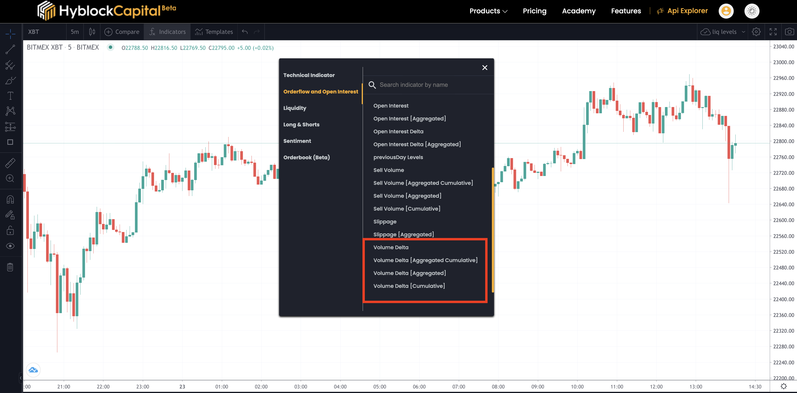 You can access the Volume Delta indicator on the Main Chart product under the Orderflow & Open Interest indicators. There are four variations of this indicator: